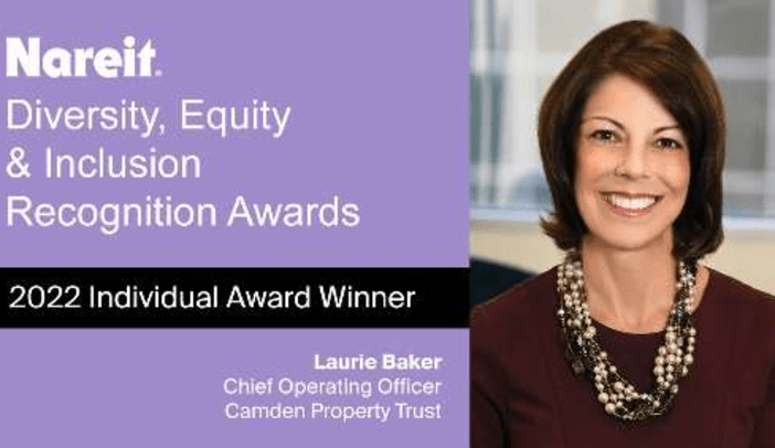 Camden firmly believes that intentional DEI builds organizational capacity, and the path forward must ensure DEI is woven into their culture, talent, and business practices. Within two years of establishing internal DEI governance, Camden was recognized with Nareit’s Gold Corporate DEI Award and Laurie Baker, their COO, was recognized with Nareit’s Individual DEI Achievement Award.